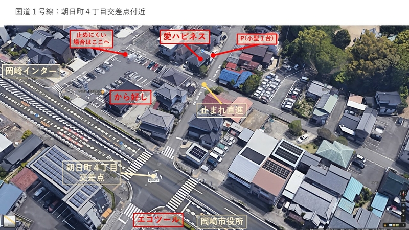 ICを降りた最初の信号から4つ目の信号(愛知スズキ販売先)を過ぎると左側に「唐揚げ専門店 から好し 岡崎栄町店」がありますので、その先の朝日町4丁目の信号交差点を、左に曲がってください。(エコツール岡崎インター店と反対側です)